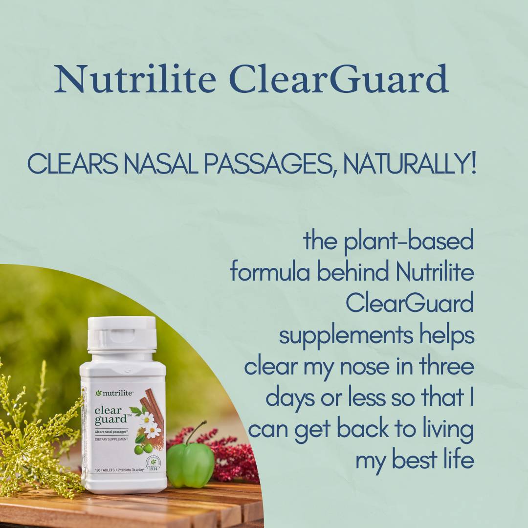 The plant-based formula behind Nutrilite™ ClearGuard™ supplements helps clear your nose in three days or less so you can get back to living your best life. A trio of acerola cherry, cinnamon, and Spanish needle work to help clear your nasal passages naturally...